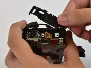 Отсоедините сборку кнопок верхней крышки от корпуса камеры, отжав защёлки по её основанию.