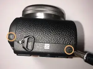 Удалите два винта Philips #00 размером 2 мм с боковой стороны камеры.
