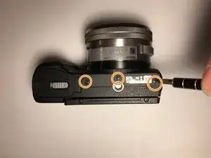 Удалите три винта Philips #00 размером 2 мм на дне камеры.