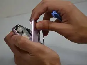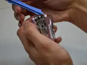 Используя пластиковую лопатку, подденьте и снимите серебряную деталь с правой стороны камеры.