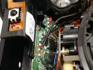 Отпаять провод, показанный на стороне рукояти камеры, чтобы обеспечить достаточный доступ к верхней части корпуса.