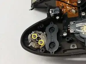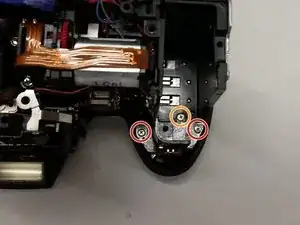 Выверните два винта с крестовой шлицей 2 мм x 4 мм — кнопка спуска и переключатель питания отпадут вниз от верхней панели.