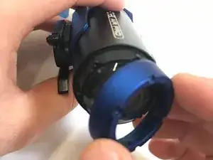 Удалите синий фиксатор крышки объектива. Затем просто снимите саму крышку объектива.