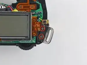 Снимите два винта Phillips 7.3 мм, крепящие верхний корпус к D70 рядом с окуляром.