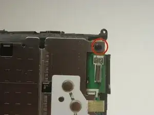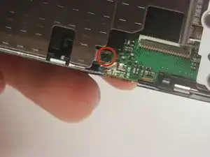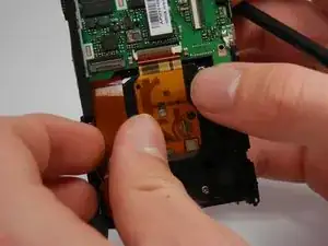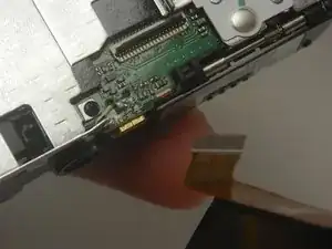 Найдите защёлку, фиксирующую ленточный кабель, соединяющий экран с материнской платой. С помощью лопатки аккуратно поднимите защёлку, чтобы освободить ленту. Осторожно отсоедините экран от материнской платы.