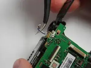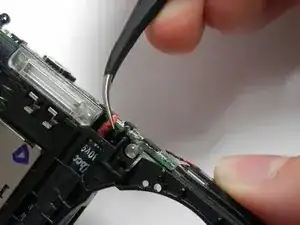 Используйте пинцет, чтобы отключить как красный, так и чёрный провода, расположенные рядом с вспышкой камеры.
