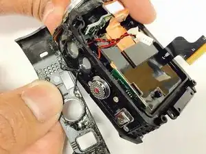 Кнопки включения и записи приклеены к отсеку батареи, поэтому осторожно подденьте их пластиковой лопаткой и снимите.