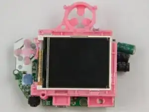 Осторожно приподнимите материнскую плату и розовый пластиковый элемент под ней. Розовый пластик содержит дисплей и соединён с материнской платой.