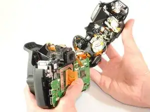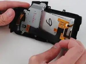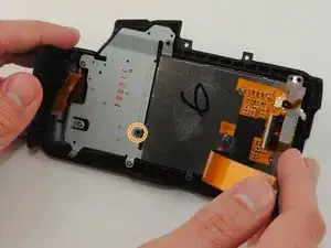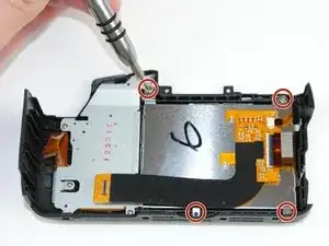 Снимите четыре серебристых винта JIS #000 длиной 4 мм, соединяющие ЖК-экран с задней частью камеры.