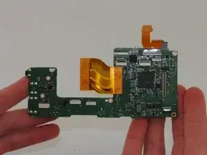 Обратите внимание на этот чёрный кабель и место его подключения к плате. Это оптоволоконный кабель, используемый для вспышки камеры. Его потребуется снова подключить после замены материнской платы.