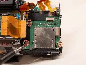 Удалите три винта JIS #000 длиной 3 мм, крепящие считыватель SD-карт к задней части устройства.