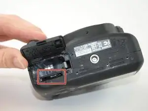 Поднимите теперь свободную крышку отсека карты/аккумулятора, чтобы открыть отсек для аккумулятора.