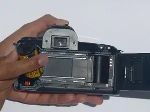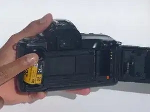 Найдите пленку с левой стороны камеры (если вы смотрите на заднюю часть камеры) и, как с батареей, начните вытаскивать верхнюю часть контейнера с пленкой.