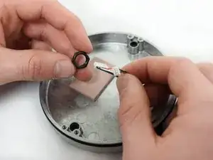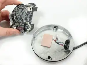 Имейте в виду, что под этим основанием всё ещё подключены кабели, и аккуратно отделите пластиковое основание с камерой от металлического основания с материнской платой.
