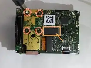 После удаления винтов аккуратно снимите плату. При lifting плиты, компьютерный чип (обведенный оранжевым) отделится от материнской платы.