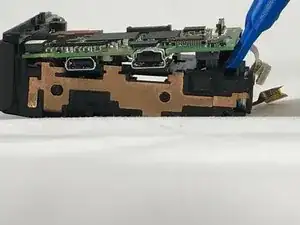 Используя инструмент для вскрытия, аккуратно снимите узел кнопок питания и спуска затвора с рамы.