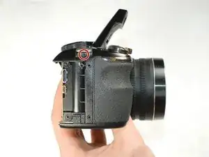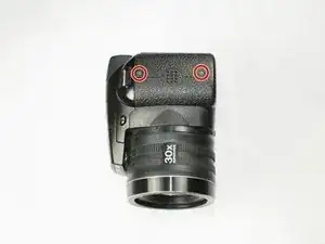 Удалите два винта Phillips #1 длиной 3,5 мм в этих местах на левом боку камеры с помощью отвертки.