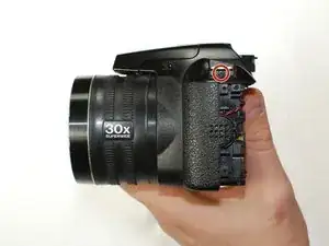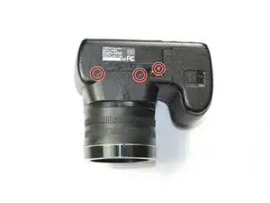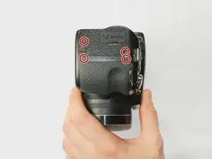 Удалите четыре винта Phillips #1 длиной 3,5 мм в этих местах на правом боку камеры с помощью отвертки.