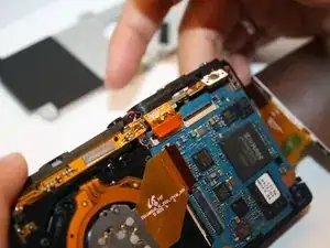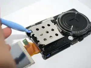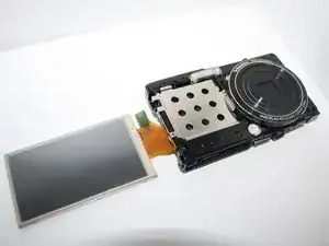 Теперь, когда задняя крышка снята, осторожно сдвиньте LCD-экран камеры вправо и положите его экраном вниз на стол.