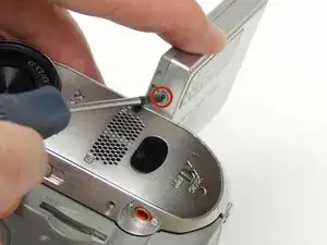 Поверните камеру так, чтобы ремешок был направлен к Вам, и снимите два винта Phillips #1 длиной 5 мм, показанные здесь.