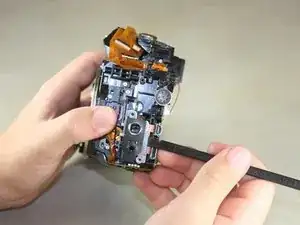 Используйте плоский конец лопатки, чтобы аккуратно отсоединить ленточный шлейф от внутренней стороны камеры.