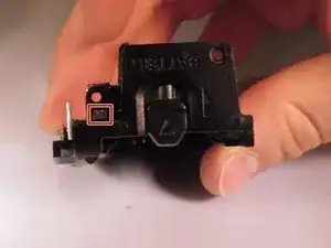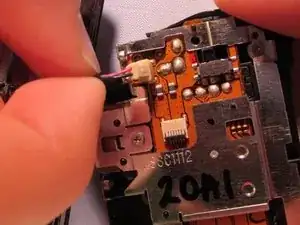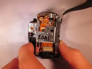 С помощью пинцета потяните чёрную деталь, соединённую с нижней стороной рычага зума, одновременно сдвигая заднюю часть под углом.