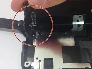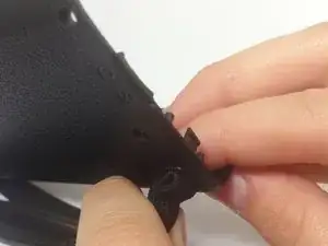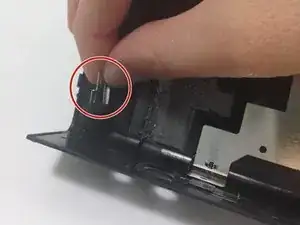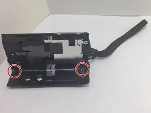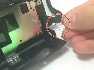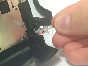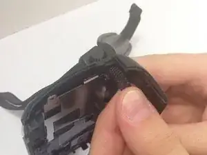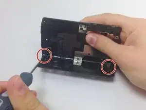 Открутите два серебристых винта Phillips #00 диаметром 0,5 мм, расположенных в нижних углах внутренней стороны боковой крышки. Это освободит две серебристые пластины, удерживающие ремешок.