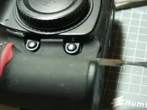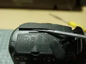 Ручка прикреплена к корпусу через язычок, который закреплён небольшим винтом, доступным через отсек для аккумулятора. Удалите аккумулятор, его можно увидеть на фото в верхнем правом углу, ближе к передней части камеры. Открутите его и сохраните винт.