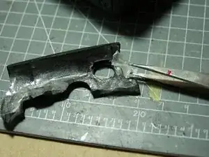 Возьмите новую резинку для ручки и с помощью пинцета снимите бумажную подложку. Эти детали очень качественно отлиты, но клейкая основа не кажется заводской стандартной.
