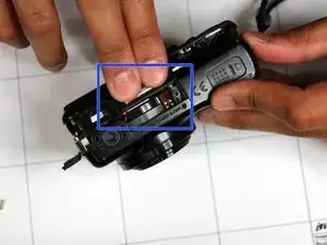 Сожмите область, отмеченную синим квадратом, и осторожно раскройте внешнюю оболочку от оставшейся части камеры.