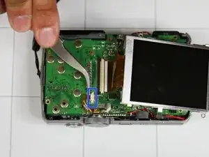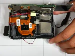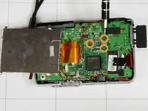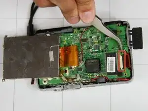 Осторожно согните печатную плату вверх (в сторону кнопки питания) до угла в 90 градусов по отношению к оставшейся части камеры.