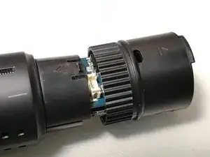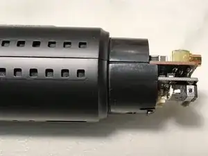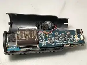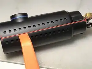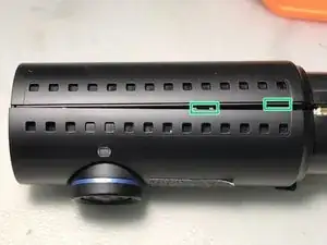 Нажатие на эту защёлку должно освободить торцевую заглушку, чтобы вы могли сдвинуть её и снять с цилиндрического корпуса видеорегистратора.