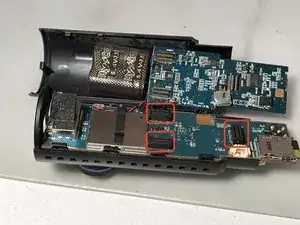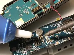 Внутри регистратора находятся две уложенные друг на друга печатные платы. С помощью пластиковой лопатки или медиатора аккуратно приподнимите верхнюю плату от нижней.