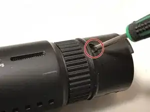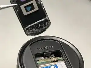 Используя маленькую ювелирную плоскую отвёртку, аккуратно подденьте один угол пластиковой крышки, закрывающей индикатор Wi‑Fi на конце видеорегистратора.