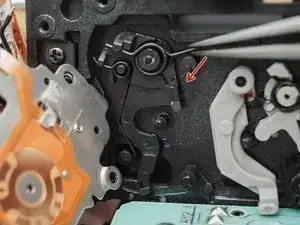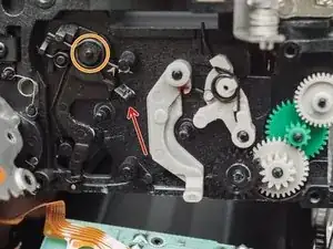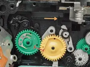 Если используется 3D-печатная запасная деталь, снимите натяжную пружину и временно установите зелёную шестерню. Поверните её против часовой стрелки через весь цикл зеркала. Шестерня не должна заедать в любой точке. При необходимости отрегулируйте приводной рычаг, пока он не будет проходить весь цикл без сопротивления.