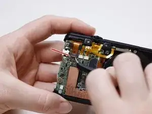 Удалите винт (3.9мм, Phillips #00), который прикрепляет тонкую металлическую рамку к камере.