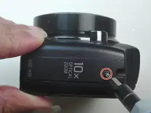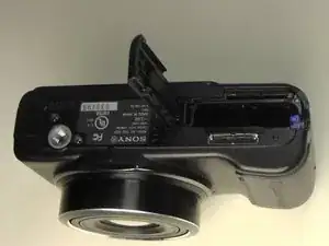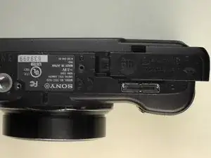 Поместите камеру вверх дном, чтобы отсек для аккумулятора был ориентирован вверх.