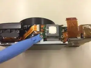 Осторожно удалите сборку шлейфа с верхней части камеры с помощью пинцета.