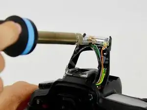 Используя паяльник, распаяйте оранжевые, бежевые и серые провода от сборки вспышки.