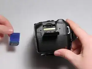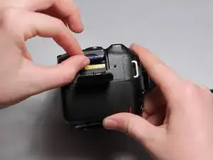 Положите камеру на бок, как показано, чтобы открыть дверцу отсека SD-карты.