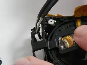 С помощью пинцета отрегулируйте и замените эти шестерёнки по необходимости. Белая шестерёнка должна быть интегрирована с остальной частью блока. Чёрная шестерёнка должна полностью занимать свою полость.