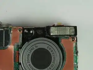 Если небольшая пластиковая деталь, описанная на предыдущем шаге, не выпала, удалите её сейчас. Деталь расположена в небольшом зазоре над объективом и слева от вспышки.