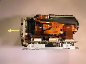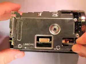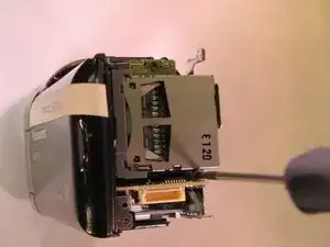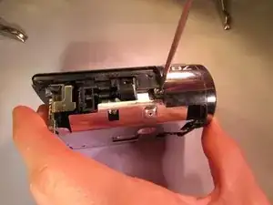 Открутите чёрный винт длиной 4 мм сзади видеокамеры, под местом установки аккумулятора.