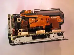 Один винт расположен возле шарнира экрана ЖК-дисплея. Второй — вблизи верхнего правого угла корпуса видеокамеры.