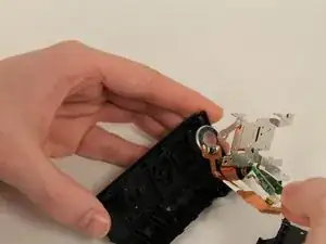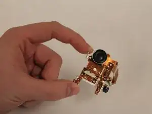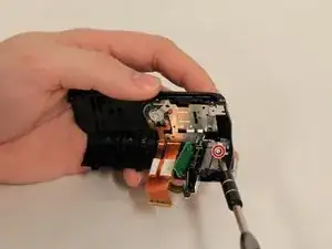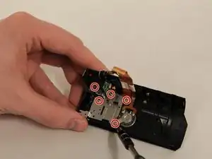 Аккуратно положите видеокамеру так, чтобы внутренняя часть была обращена вверх, и снимите винт Phillips #000 длиной 3 мм, показанный на изображении.