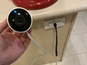 Отличная работа! Подключите новый USB-кабель к сетевому адаптеру (или к сопоставимому USB-источнику питания) и подождите, пока камера включится. Если всё в порядке, вы увидите сначала синий, а затем зелёный индикатор. При необходимости используйте приложение Nest для настройки камеры.
