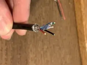 Вы должны увидеть красный провод, черный провод и ещё два провода, собранные в дополнительной оплётке. Также может быть свободная металлическая оплётка вокруг проводов, которую можно оттянуть и отрезать.