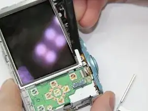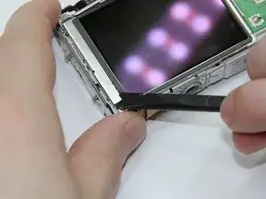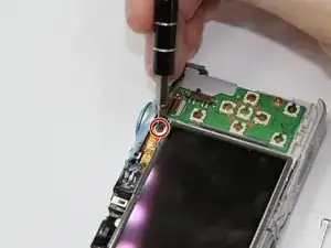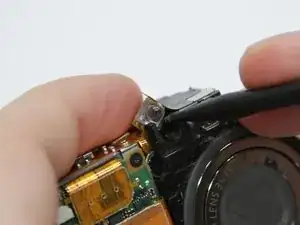 Снимите два винта (2 мм, Phillips 00) вдоль заднего края рамки камеры прямо позади блока вспышки.