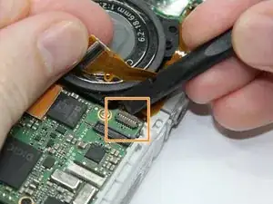 Используйте лопаточку, чтобы приподнять язычок разъёма с нулевым усилием вставки Zero Insertion Force (ZIF), расположенного на блоке вспышки. Снимите гибкий кабель.