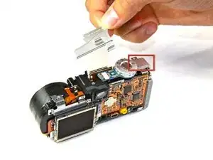 Удалите винт Phillips #000 длиной 3.0 мм над дверцей батареи сбоку камеры.